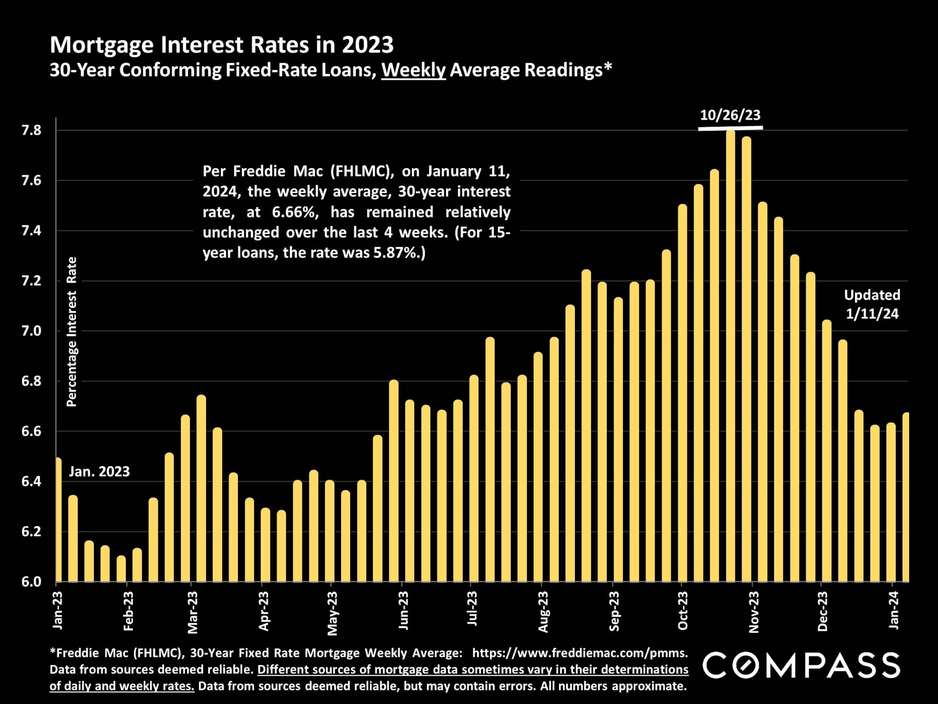 Have your heard? Mortgage Rates have been steadily declining over the last month or so. Freddie Mac on Jan 11, 2024, reported the weekly average, 30-year interest rate, is 6.66%. This average has remained unchanged for the last four weeks. However, it is not expected to decline much further at this time, as the Fed ponders current economic activity. If you are considering a purchase, now may be a good time for loan rates as well as some softening of home pricing.